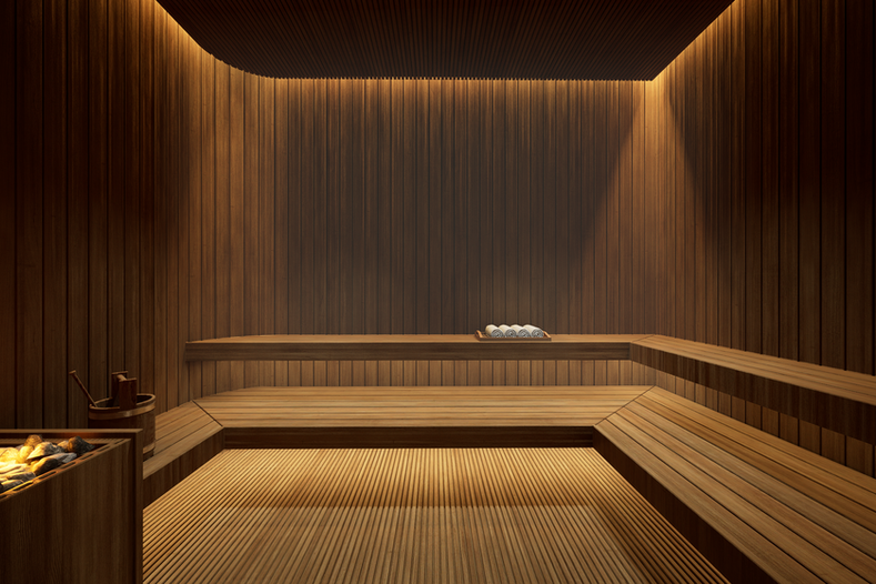 The villa complex offers a café, private spa, gym, sauna, cold plunge, and 24-hour security